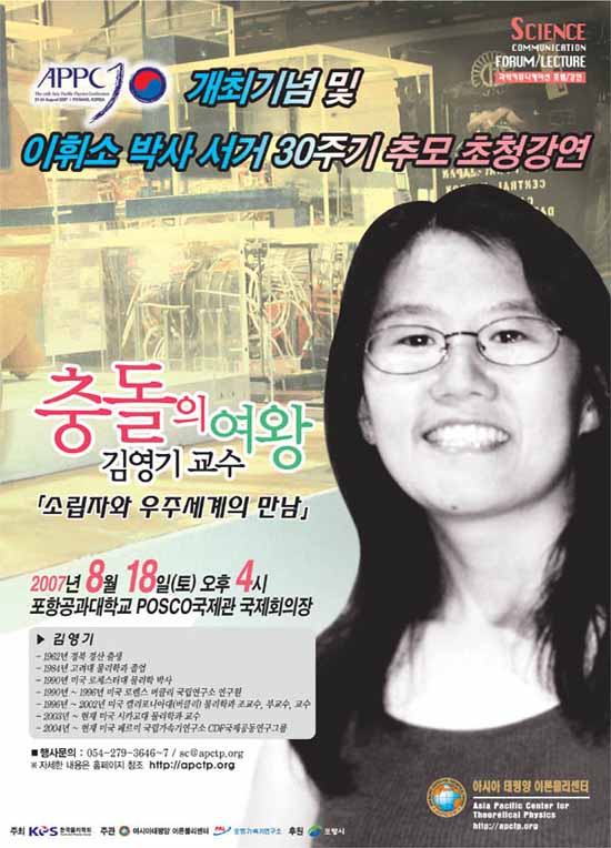 □ 행사 개요 ◦ 일 시 : 2007년 8월 18일(토) 오후 4시 ◦ 장 소 : 포항공과대학교 POSCO 국제관 국제회의실 ◦ 주 제 : 소립자와 우주세계의 만남 ◦ 대 상 : 고등학생, 대학생, 일반 등 ◦ 주 최 : 한국물리학회 ◦ 주 관 : 아태이론물리센터, 포항가속기연구소 ◦ 후 원 : 포항시