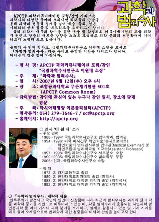 APCTP 과학커뮤니케이션 포럼/강연 시리즈는 과학자와 다양한 분야의 오피니언 리더들의 만남을 통해 과학의 전통적 경계를 넘어 예술, 문화, 언론, 사회와의 상호 접목 및 네트워크를 모색하고자 합니다. 특히 과학자 내부의 참여를 통한 대중 및 학생과의 커뮤니케이션과 고급 과학자 컨텐츠 창출의 새로운 방향을 스스로 모색하고 과학 문화의 저변확대에 기여하고자 노력해 오고 있습니다. 올해의 두 번째 행사로, 국립과학수사연구소 이원태 소장을 모시고 「과학과 범죄수사」라는 주제로 유익한 시간을 가지고자 합니다. 여러분의 많은 참여 바랍니다.