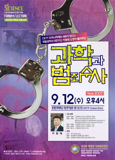 □ 행사 개요 ◦ 행 사 명 : APCTP 과학커뮤니케이션 포럼/강연 -국립과학수사연구소 이원태 소장 ◦ 주 제 : 「과학과 범죄수사」 ◦ 일 시 : 2007년 9월 12일(수) 오후 4시 ◦ 장 소 : 포항공과대학교 무은재기념관 501호 (APCTP Common Room) ◦ 참여방법 : 강연에 관심이 있는 누구나 강연 일시, 장소에 맞게 방문 ◦ 주 최 : 아시아태평양 이론물리센터(APCTP) ◦ 행사문의 : 054) 279-3646~7 / sc@apctp.org ◦ 홈페이지 : http://apctp.org