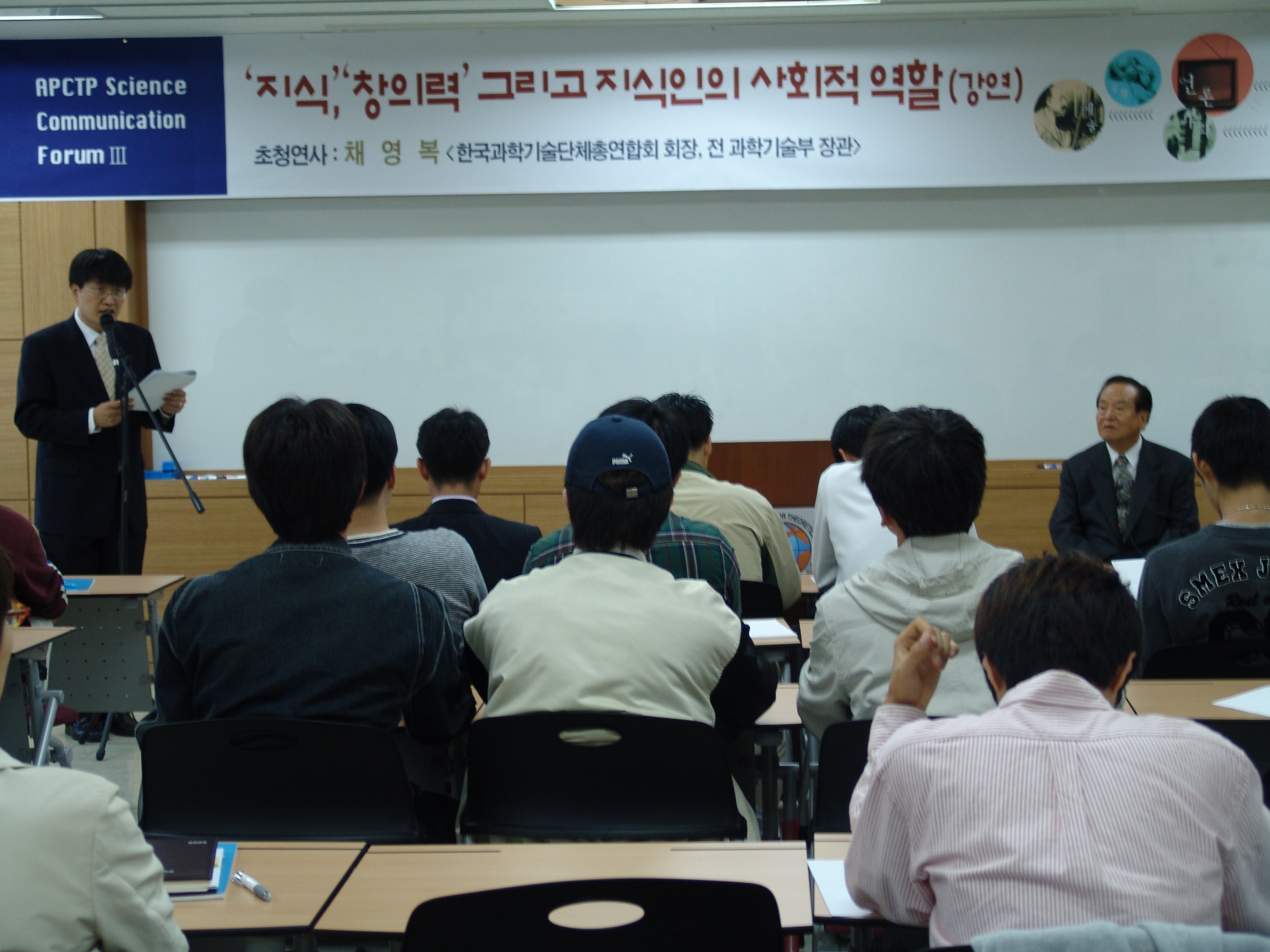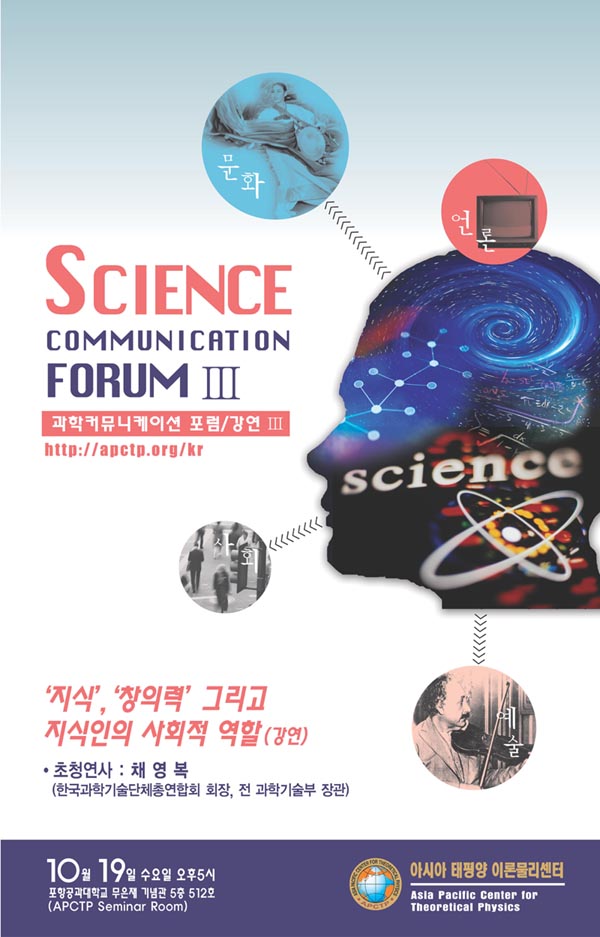 APCTP 과학커뮤니케이션 강연/포럼은 과학의 경계를 넘어 다양한 분들의 유익한 강연을 듣거나 자유로운 분위기에서 함께 이야기를 나누며 토론하는 사랑방 같은 곳으로 기획된 프로그램입니다. 지난 첫 모임은 서강대 이덕환 교수님과 함께 ‘과학커뮤니케이션이란 무엇인가’에 대해 심도깊은 토론을 벌였고 두 번재 모임은 동아사이언스 김두희 대표이사님을 모시고 ‘과학과 언론’이라는 주제로 아주 뜻깊은 시간을 가졌습니다. 이제 10월 19일 국내 과학계의 거목 채영복 과학기술총연합회 회장(전 과학기술부 장관)님을 모시고 지식과 지혜를 주제로 유익한 말씀을 듣고자 합니다.