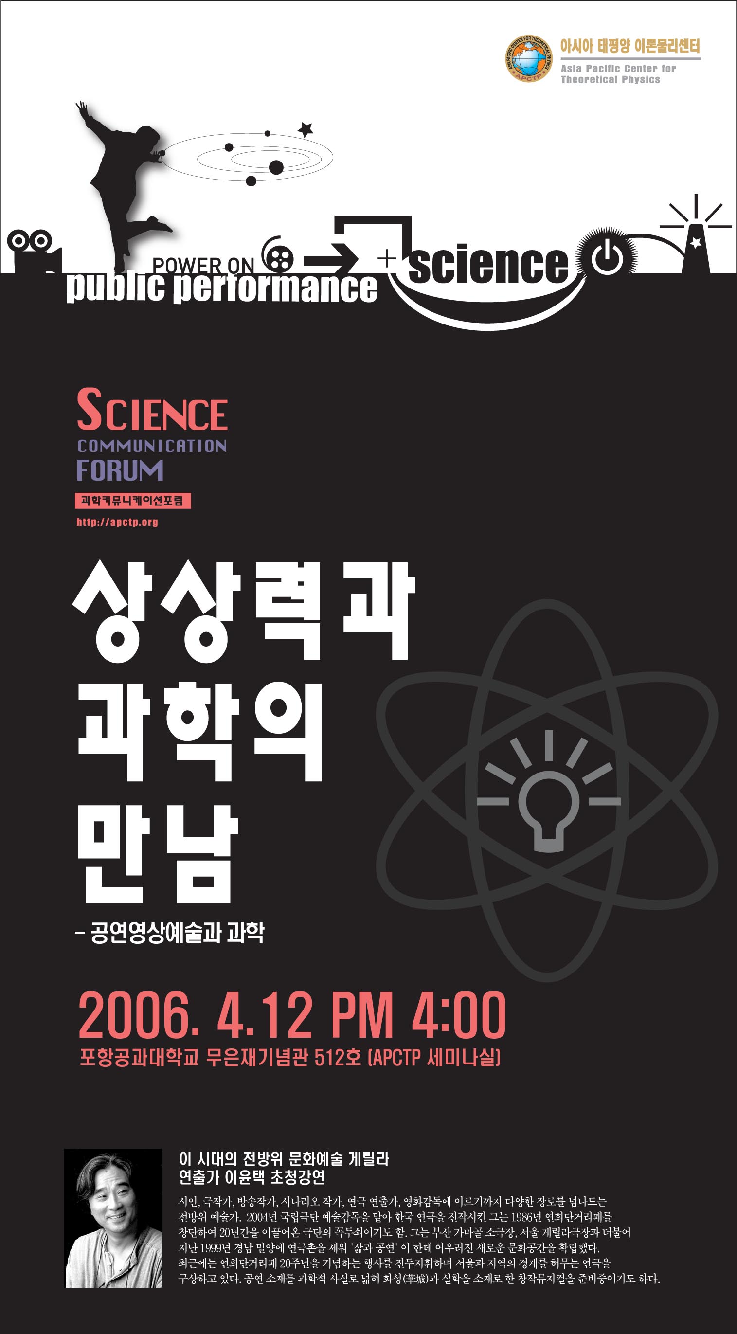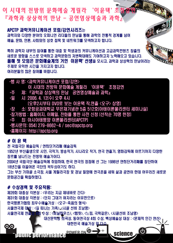 □ 행사 개요 ◦ 행사명 : <과학커뮤니케이션 포럼/강연> 이 시대의 전방위 문화예술 게릴라 ‘이윤택’ 초청강연 ◦ 일 시 : 2006.4.12(수) 오후 4시 (오후2시부터 DVD로 보는 이윤택 작,연출 <오구> 상영) ◦ 장 소 : 포항공과대학교 무은재기념관 5층 512호(아태이론물리센터 세미나실) ◦ 주 최 : 아시아태평양 이론물리센터(APCTP) ◦ 행사문의 : 054) 279-8662~4 / sec@apctp.org ◦ 홈페이지 : http://apctp.org ※ 자세한 내용은 홈페이지를 참조하세요.