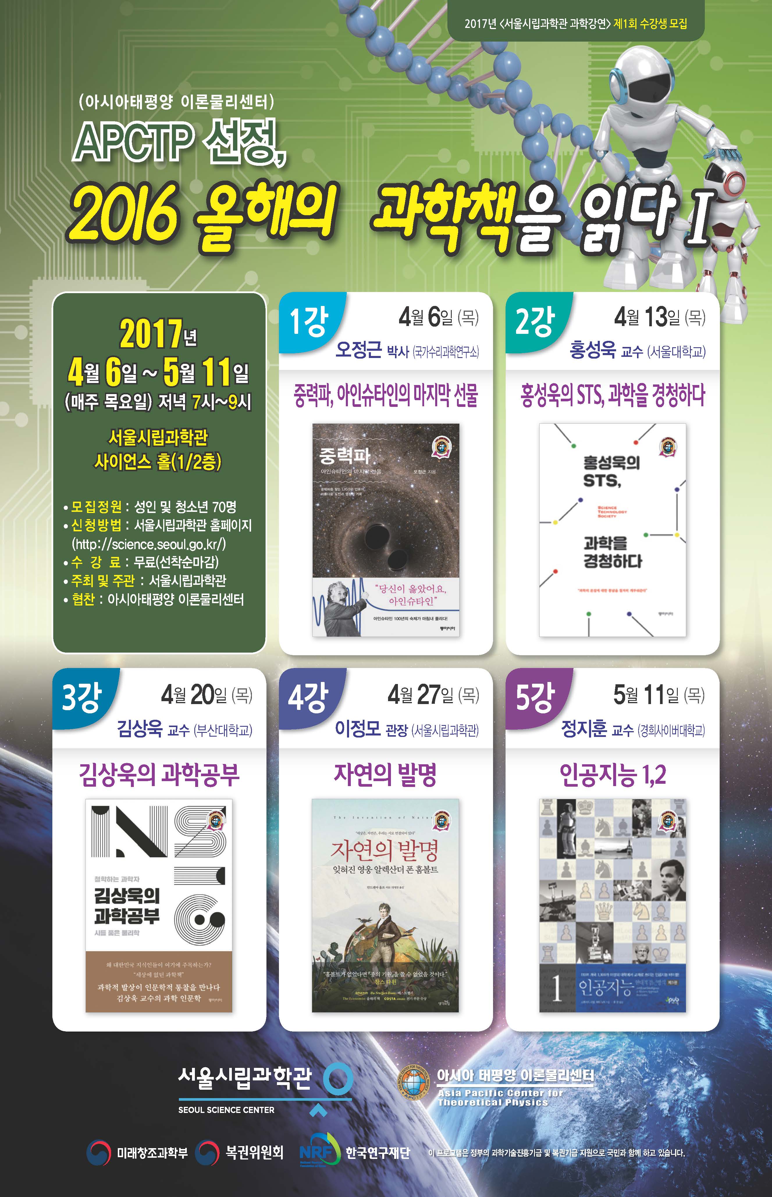 | Subject | APCTP 선정, 2016 올해의 과학도서 강연회 - 서울시립과학관 (APCTP 2016 Science Book Lecture Series @ Seoul Science Center) | |