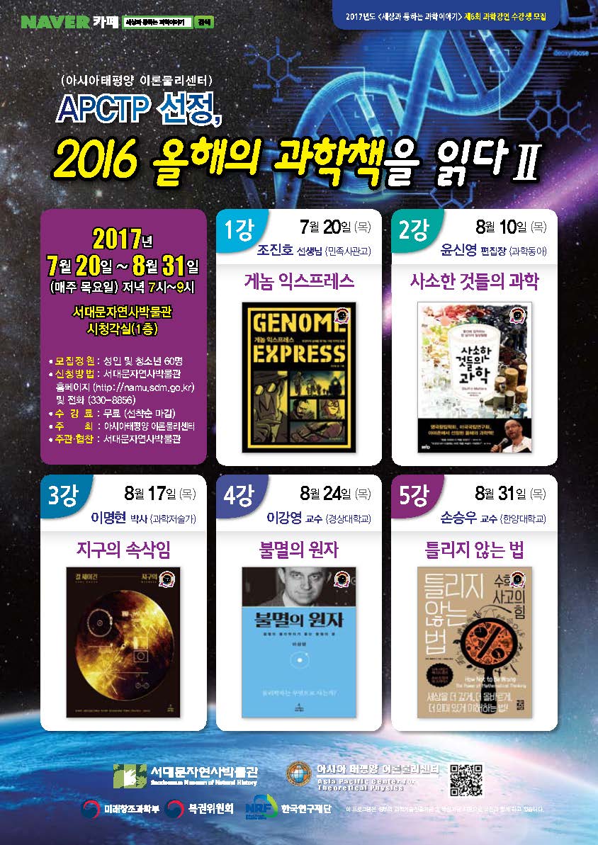 ◦ 행 사 명 : APCTP 과학 커뮤니케이션 포럼/강연 ◦ 주 제 : APCTP 선정, 2016 올해의 과학도서 강연회 ◦ 일 시 : 2017. 7. 20 ~ 8. 31(매주 목요일), 19:00 ~ 21:30 ◦ 장 소 : 서대문자연사박물관 시청각실(1층) ◦ 대 상 : 성인 및 청소년(초등학생 제외) ◦ 신청방법 : 서대문자연사박물관 홈페이지(https://namu.sdm.go.kr/site/main/home) ◦ 주 최 : 아시아태평양 이론물리센터 ◦ 주관, 협찬 : 서대문자연사박물관