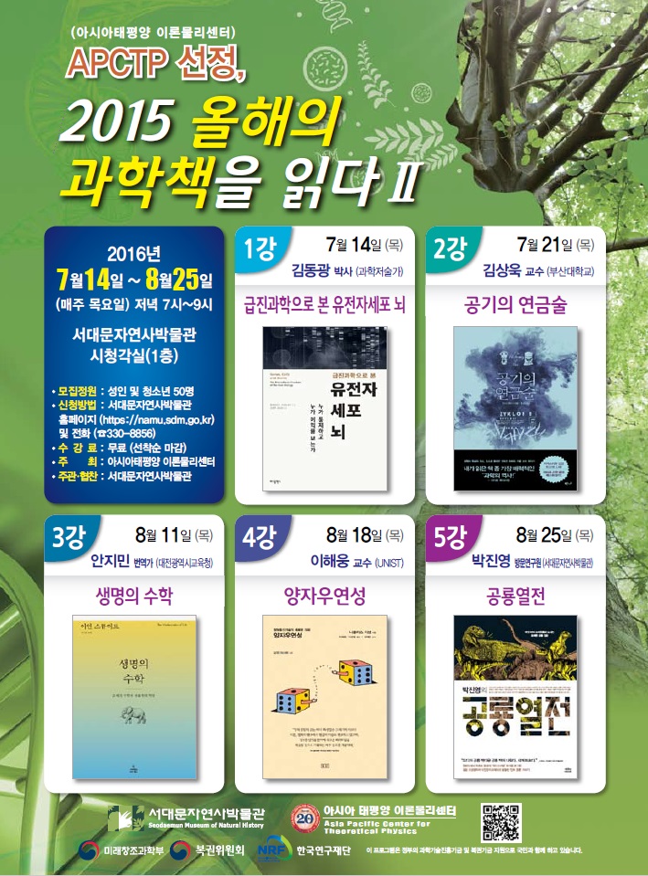 ◦ 행사명 : APCTP 과학커뮤니케이션 포럼/강연 ◦ 주 제 : APCTP 선정, 2015 올해의 과학도서 강연회 ◦ 일 시 : 2016. 7. 14(목), 19:00 ~ ◦ 장 소 : 서대문자연사박물관 1층 시청각실 ◦ 대 상 : 성인 및 청소년(초등학생 제외) ◦ 주 최 : 아시아태평양 이론물리센터, 서대문자연사박물관 ◦ 강연일정 - 강연 도서 : 급진과학으로 본 유전자세포 뇌 - 초청 연사 : 김동광 박사(과학저술가)