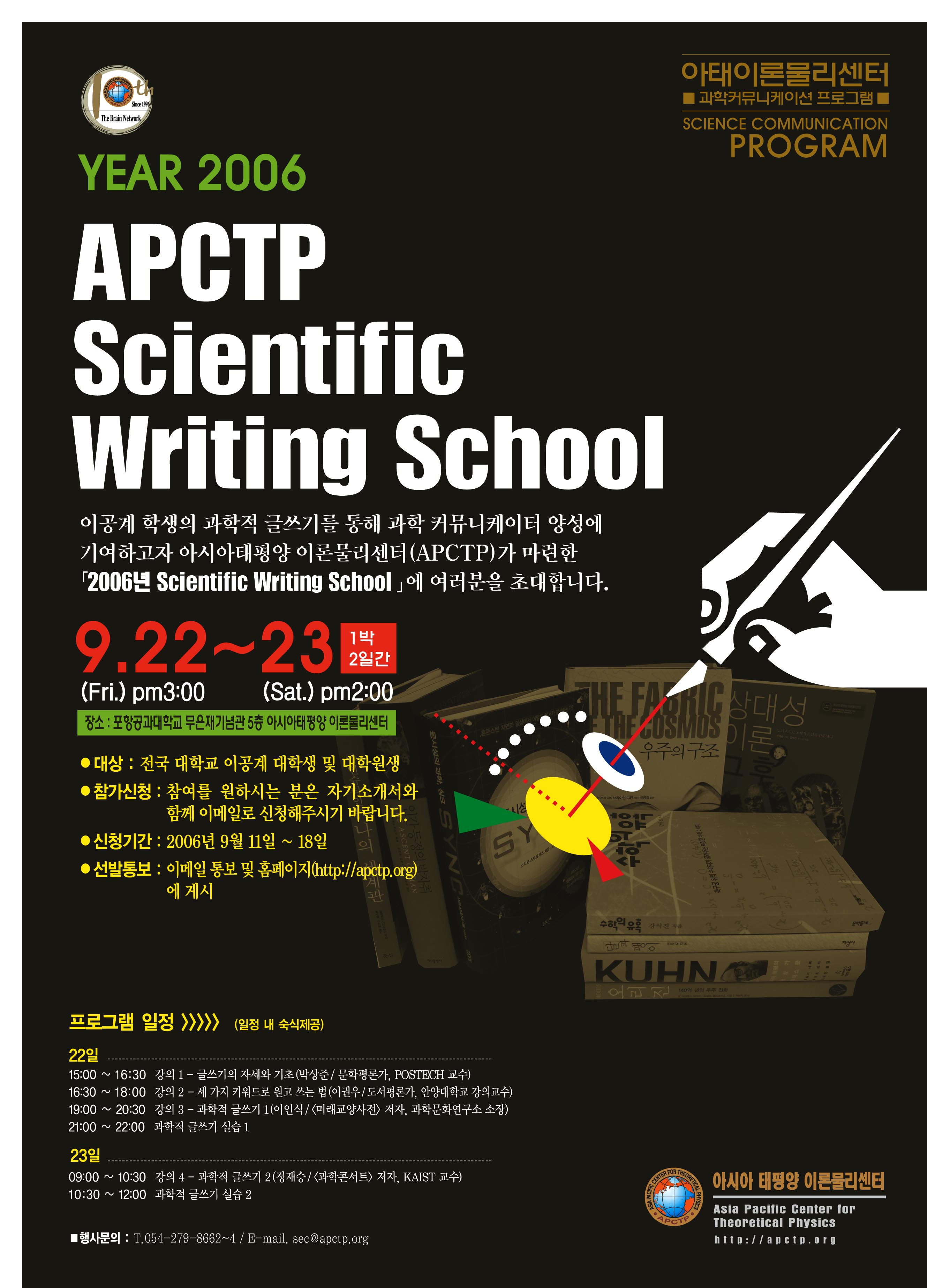 이공계 학생의 과학 글쓰기를 통해 과학 커뮤니케이터 양성에 기여하고자 아시아태평양 이론물리센터가 마련한 ‘2006년 Science Writing School’에 여러분을 초대합니다.