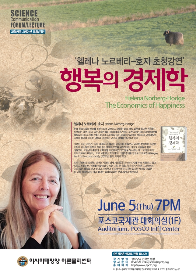 □ 행사개요<?xml:namespace prefix = "o" /> • 행 사 명 : APCTP 과학커뮤니케이션 포럼/강연 • 주 제 : 행복의 경제학(The Economics of Happiness) • 연 사 : Helena Norberg-Hodge • 일 시 : 2014년 6월 5일(목) 오후 7시 • 장 소 : 포스코국제관 대회의실 • 대 상 : 학생 및 일반인 • 주최/주관 : 아시아태평양 이론물리센터