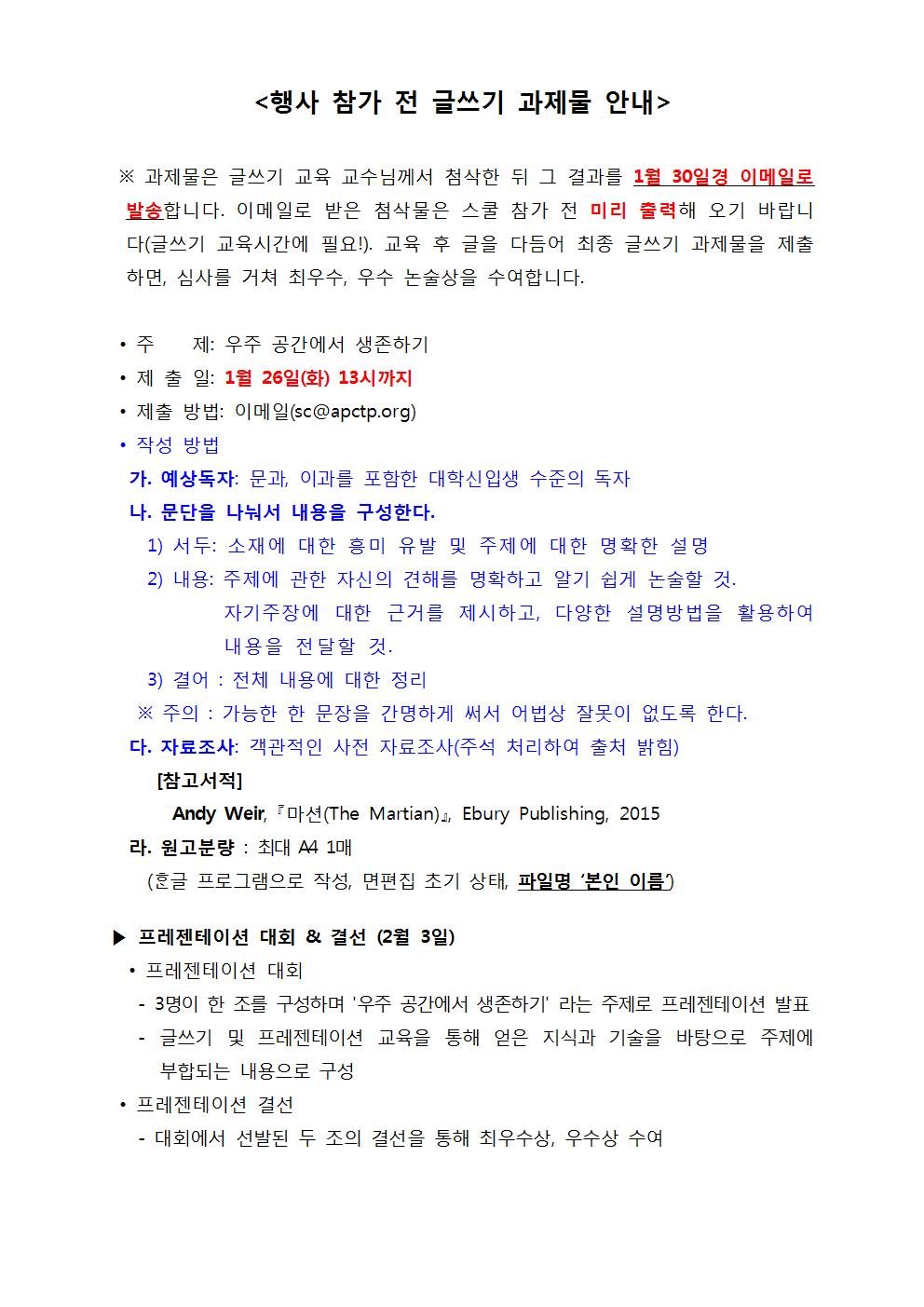 | Subject | 제15기 APCTP 과학커뮤니케이션 스쿨 합격자 발표 (Announcement of the successful 15th Science Communication School candidates) | |