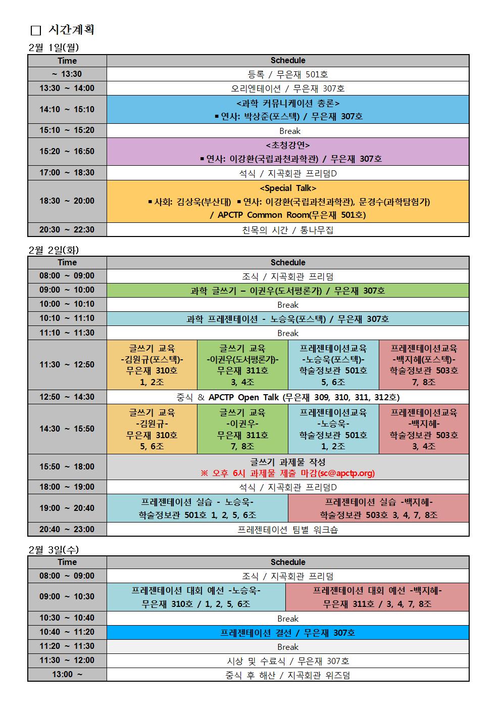 ○ 행사 개요 ∙ 일시: 2016년 2월 1일(월) - 3일(수) [2박 3일간] ※ 스쿨 기간 동안 숙소 및 식사 제공 ∙ 장소: 아시아태평양 이론물리센터 포항본부(POSTECH 내 무은재기념관) ∙ 프로그램: 과학글쓰기 및 프레젠테이션 교육, APCTP Special Talk, Open Talk, 초청강연 등