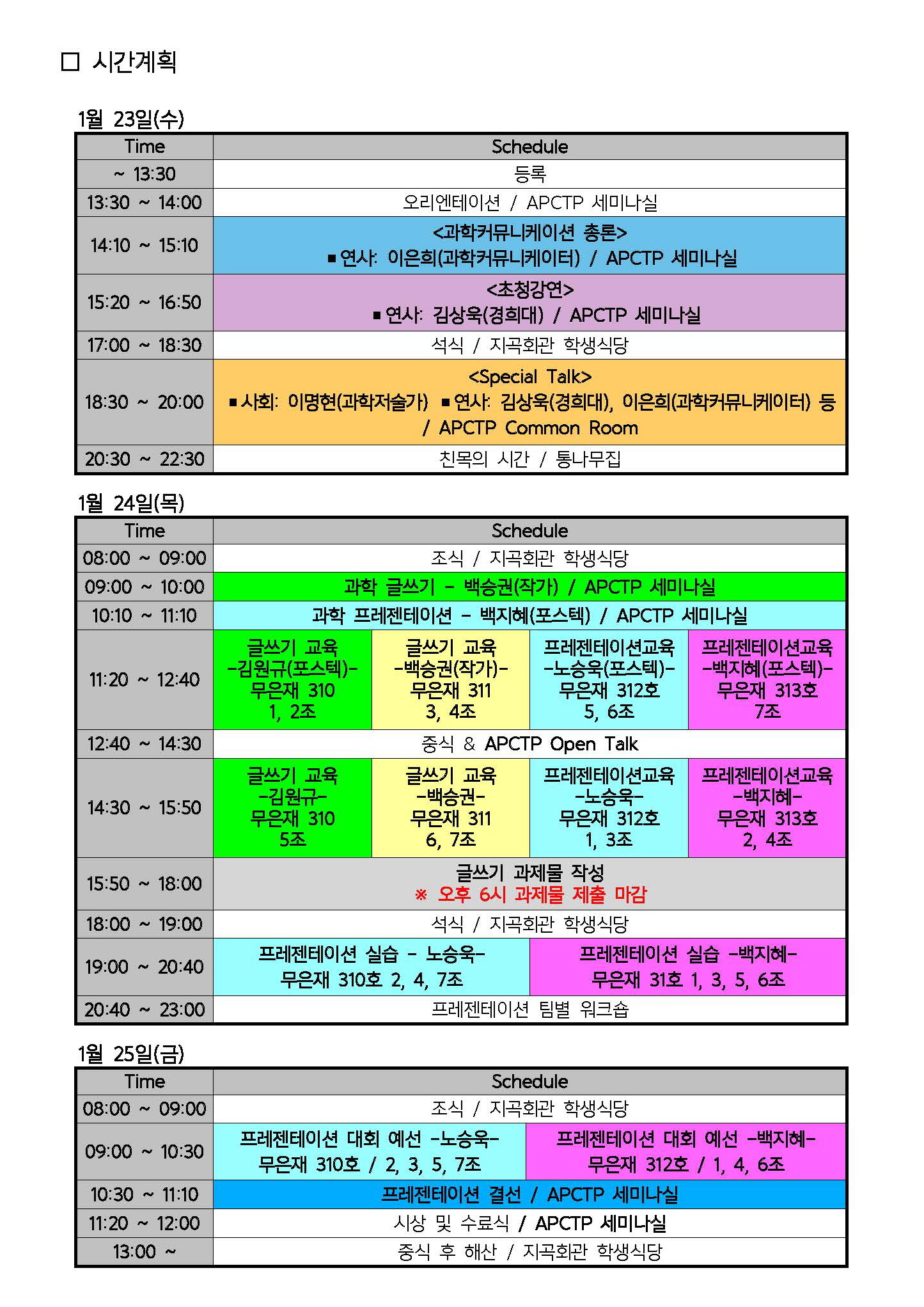 ()아시아태평양이론물리센터(APCTP)는 과학지식을 기초로 논리적인 글쓰기 및 프레젠테이션에 능숙한 미래의 과학자를 양성하기 위해 18기 APCTP 과학커뮤니케이션 스쿨 개최합니다. 과학 글쓰기 및 프레젠테이션특별 초청강연 등 학생 여러분이 알차고 뜻깊은 방학을 보내실 수 있도록 다양한 프로그램들을 마련했으니 여러분의 많은 관심과 참여를 바랍니다.