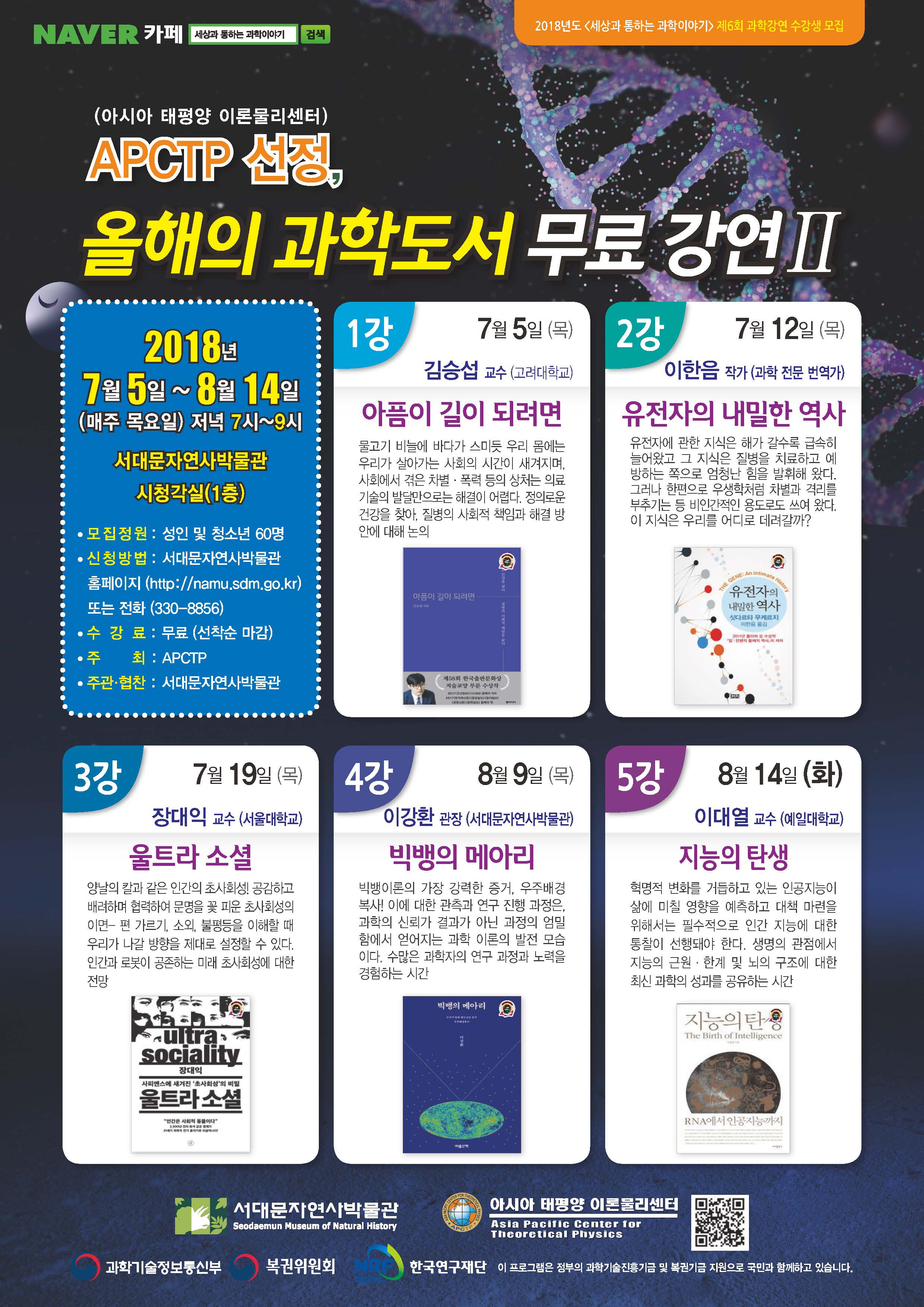 ◦ 행 사 명 : APCTP 과학커뮤니케이션 포럼/강연 ◦ 주 제 : APCTP 선정, 올해의 과학도서 무료강연 Ⅱ ◦ 기 간 : 2018. 8. 14(목), 19:00 ~ 21:00 ◦ 장 소 : 서대문자연사박물관 1층 시청각실 ◦ 연 사 : 이대열 교수(예일대학교) ◦ 대 상 : 성인 및 청소년 ◦ 신청방법 : 서대문자연사박물관 홈페이지(https://namu.sdm.go.kr/site/main/home) ◦ 주 최 : (재)아시아태평양이론물리센터 ◦ 주관/협찬 : 서대문자연사박물관
