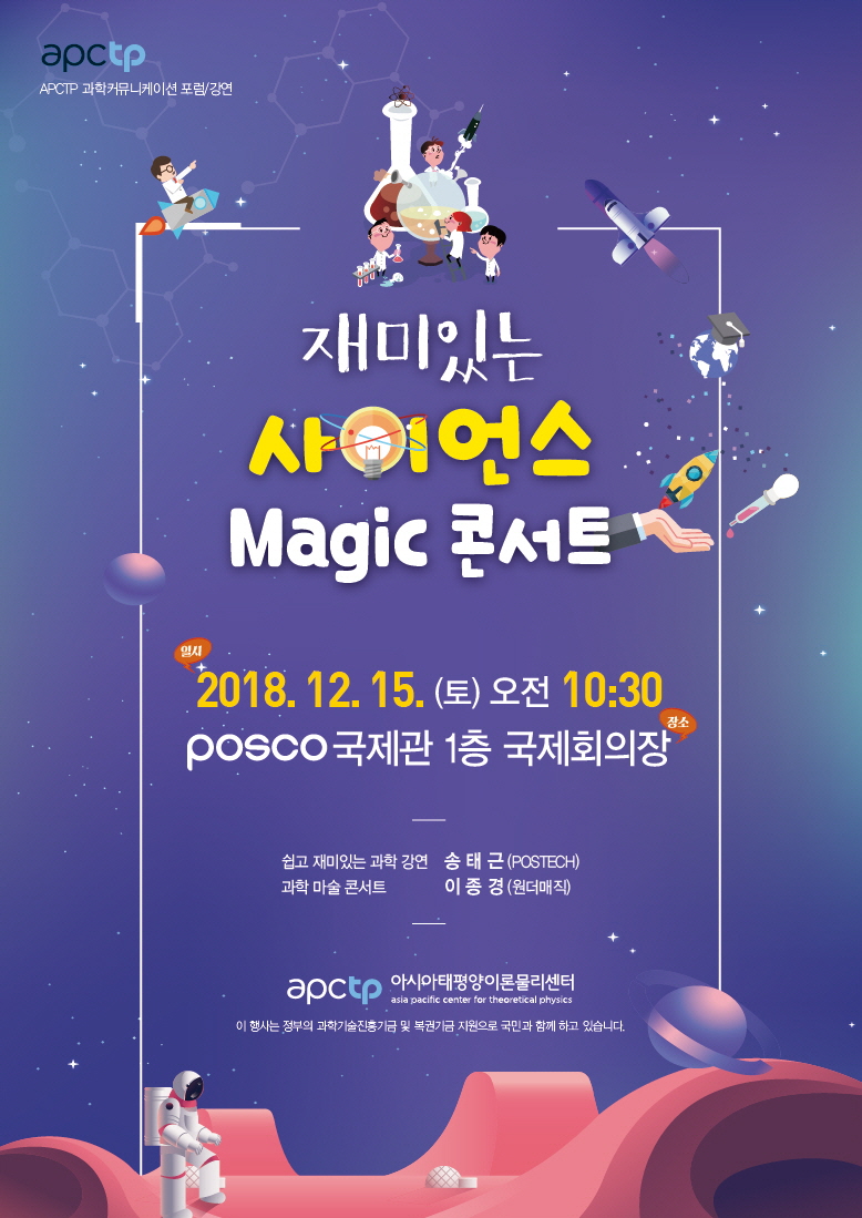 ◦ 행사명 : APCTP 과학커뮤니케이션 포럼/강연 『재미있는 사이언스 매직 콘서트』 ◦ 주 제 : 지역아동센터와 함께하는 재미있는 과학강연 ◦ 일 시 : 2018년 12월 15일(토) 10:30 ~ ◦ 장 소 : POSCO국제관 1층 국제회의장 ◦ 강 연 : 송태근 박사(POSTECH) - 어린이 눈높이에 맞춘 과학과 과학자에 대한 소개 ◦ 공 연 : 최형배 과학매지션(원더매직) - 과학원리를 활용한 마술 콘서트 ◦ 대 상 : 지역아동센터 어린이 및 관계자 ◦ 주최/주관 : (재)아시아태평양이론물리센터 Attach Files |