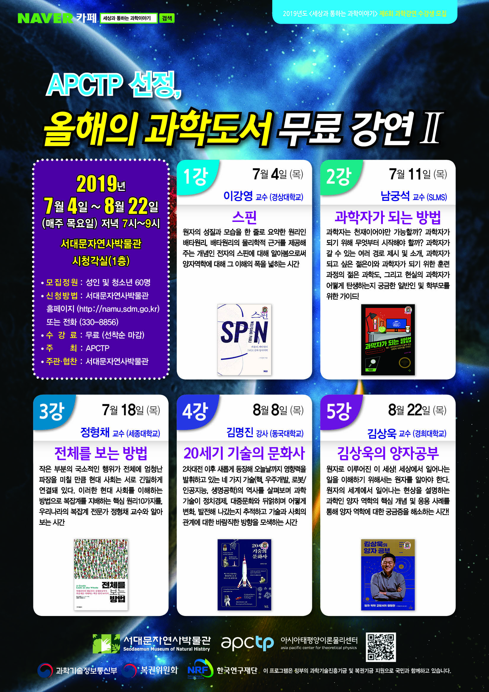◦ 행 사 명 : APCTP 과학커뮤니케이션 포럼/강연 ◦ 주 제 : APCTP 선정, 올해의 과학도서 무료강연Ⅱ ◦ 일 정 : 2019. 7. 4(목) ~ 8. 22(목) - 매주 목요일 ◦ 시 간 : 19:00 ~ 21:00 ◦ 장 소 : 서대문자연사박물관 1층 시청각실 ◦ 대 상 : 성인 및 청소년 ◦ 주 최 : (재)아시아태평양이론물리센터 ◦ 주관/협찬 : 서대문자연사박물관