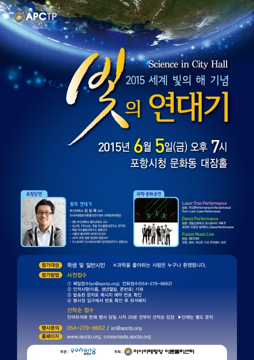 o 행 사 명 : Science in City Hall – 빛의 연대기 o 일 시 : 2015년 6월 5일(금) 오후 7시 o 장 소 : 포항시청 문화동 대잠홀 o 대 상 : 학생 및 일반시민 o 주 최 : 포항시 o 주 관 : 아시아태평양 이론물리센터 o 행사내용 – 초청강연 : ‘빛의 연대기’ 김상욱 교수(부산대학교 물리교육학과) – 초청공연 : 레이저퍼포먼스그룹 ‘PID' 영일고등학교 댄스팀 'ABLE' 뮤직라이브 퓨전밴드 'BESTAR' o 참가방법 : 사전접수 & 선착순 입장 - 사전접수 ① 접수방법 메일접수(sc@apctp.org) ② 인적사항(이름, 생년월일, 폰번호) 기재 ③ 발송된 문자메세지를 통해 예약번호 확인 ④ 행사장 입구에서 번호 확인 후 좌석 배정 - 선착순입장 : 잔여 좌석분에 한해 행사 당일 시작 20분 전부터 선착순 입장 ※ 단체는 별도 문의