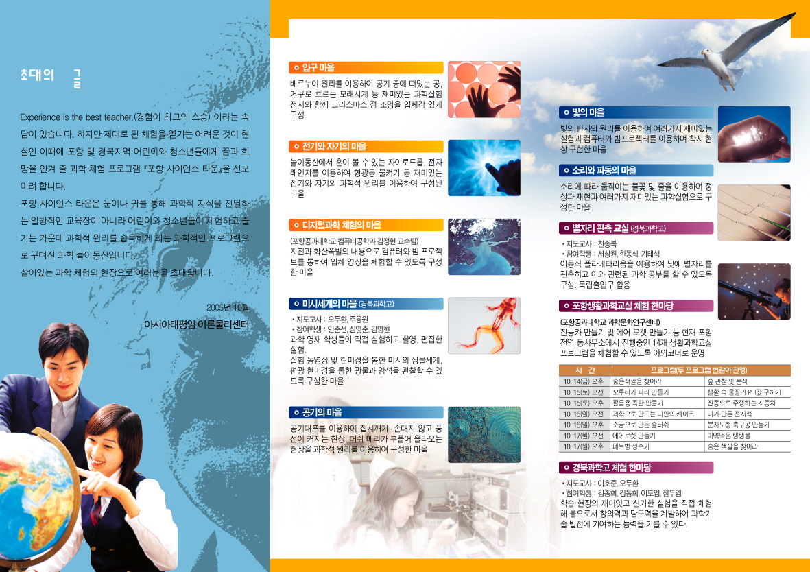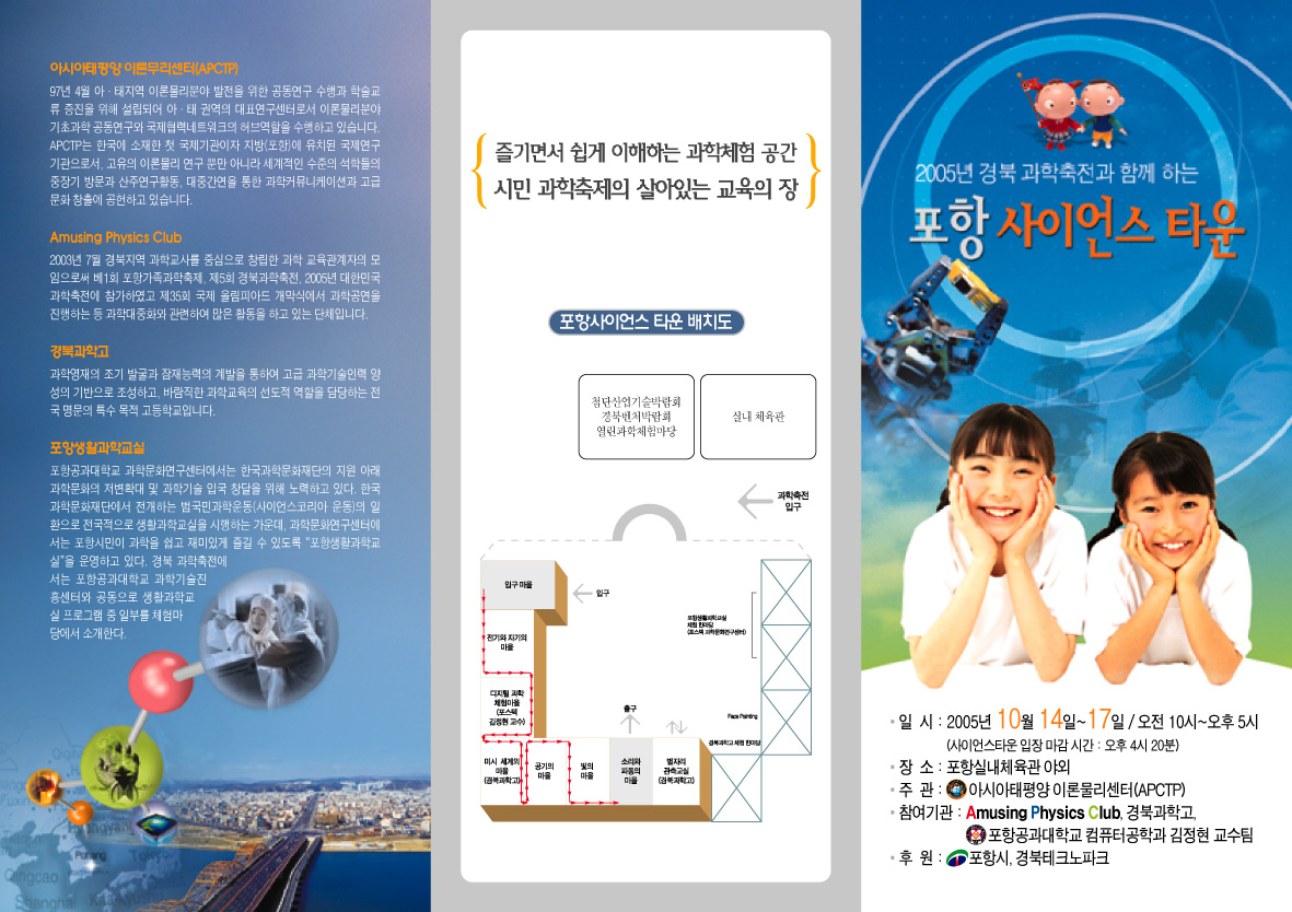 Experience is the best teacher.(경험이 최고의 스승) 이라는 속담이 있습니다. 하지만 제대로 된 과학 체험을 얻기는 어려운 것이 지금의 현실입니다. 이에 아태이론물리센터는 포항 및 경북지역 어린이와 청소년들에게 꿈과 희망을 심어줄 과학 체험 프로그램‘포항 사이언스 타운’을 선보이려 합니다. 포항 사이언스 타운은 과학적 지식을 일방적으로 전달하는 주입식의 교육장이 아니라 어린이와 청소년들이 함께 체험하고 즐기는 가운데 과학적 원리를 습득하도록 꾸며진 과학 놀이동산입니다. 행사명 : 제2회 포항가족과학축제 경북과학고등학교, 포항생활과학교실 Attach Files |