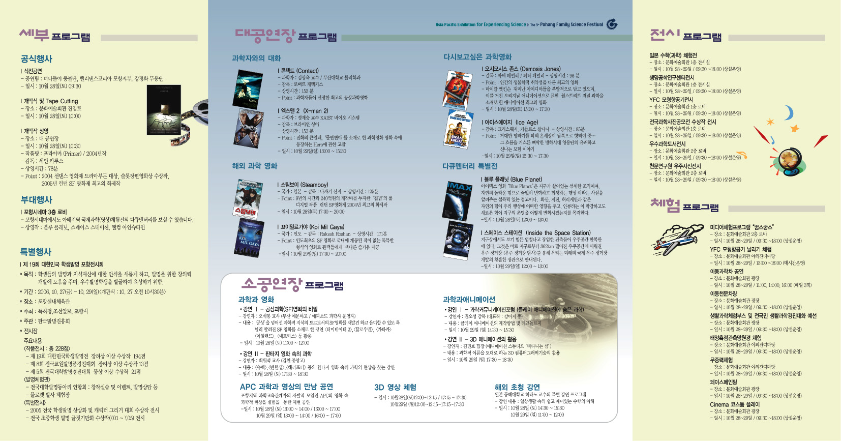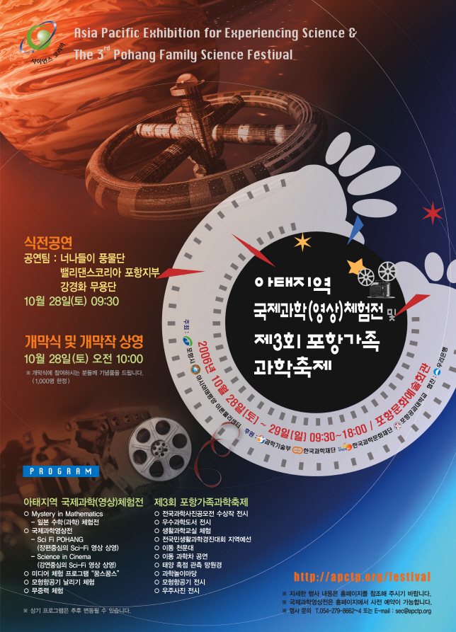 ◦ 행 사 명: 제3회 포항가족과학축제 및 과학 체험 한마당 ◦ 장 소: 포항문화예술회관 ◦ 주 관: 아시아태평양 이론물리센터 - Attach Files |