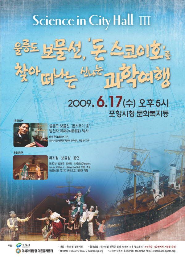 울릉도 보물선‘돈 스코이호’를 찾아 떠나는 신나는 과학여행 ◦ 행 사 명 : Science in City Hall Ⅲ ◦ 일 시 : 2009. 6. 17(수) 오후 5시 ◦ 장 소 : 포항시청 문화복지동 ◦ 대 상 : 학생 및 일반시민 ◦ 주 최 : 포항시 ◦ 주 관 : 아시아 태평양 이론물리센터