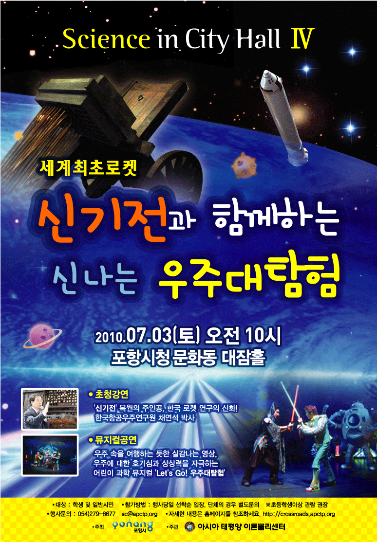 신기전과 함께하는 신나는 우주대탐험 ◦ 행 사 명 : Science in City Hall Ⅳ - 신기전과 함께하는 신나는 우주대탐험 ◦ 일 시 : 2010. 7. 3(토) 오전 10시 ◦ 장 소 : 포항시청 문화동 대잠홀 ◦ 대 상 : 학생 및 일반시민 ◦ 주 최 : 포항시 ◦ 주 관 : 아시아 태평양 이론물리센터 ◦ 행사내용 : 초청강연, 뮤지컬 공연 - 초청연사 : 한국항공우주연구원 채연석 박사 - 뮤지컬 ‘Let's Go! 우주대탐험’ (극단 올리브 & 곰달래)