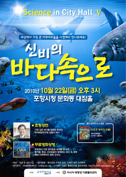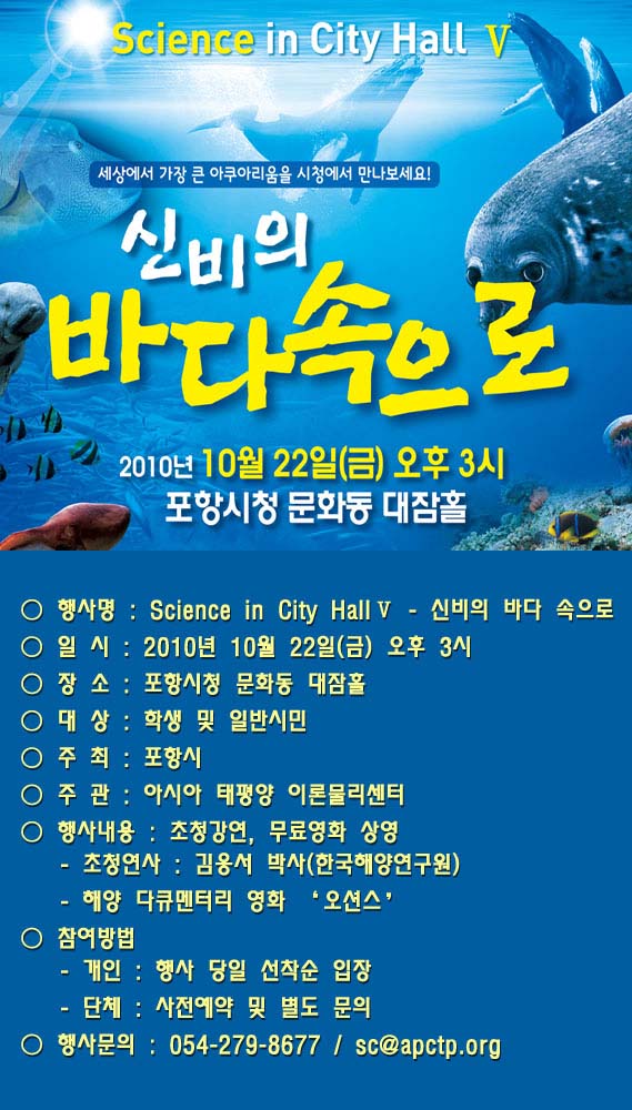 Science in City HallⅤ - 신비의 바다 속으로 ◦ 일 시 : 2010년 10월 22일(금) 오후 3시 ◦ 장 소 : 포항시청 문화동 대잠홀 ◦ 대 상 : 학생 및 일반시민 ◦ 주 최 : 포항시 ◦ 주 관 : 아시아 태평양 이론물리센터 ◦ 행사내용 : 초청강연, 무료영화 상영 - 초청연사 : 김웅서 박사(한국해양연구원) - 해양 다큐멘터리 영화 ‘오션스’