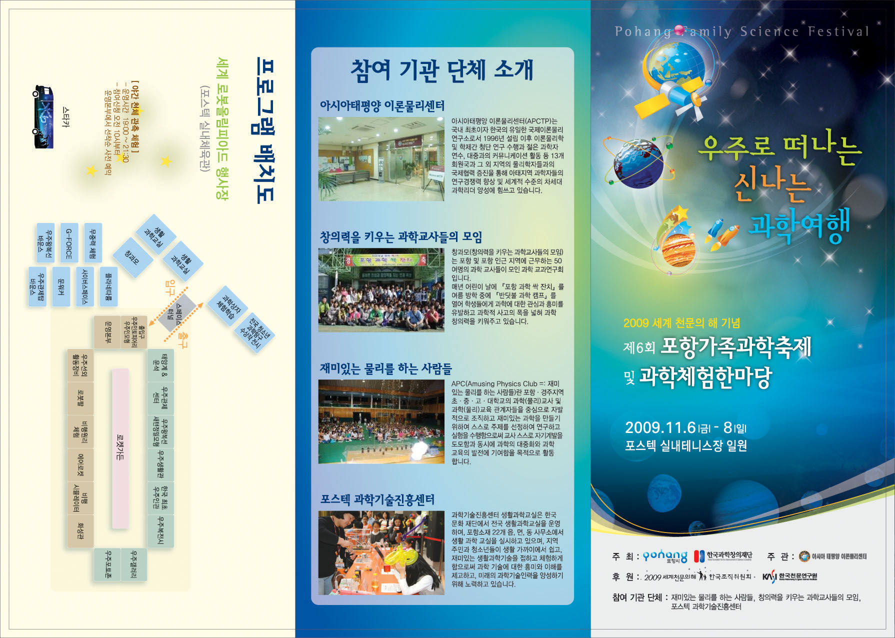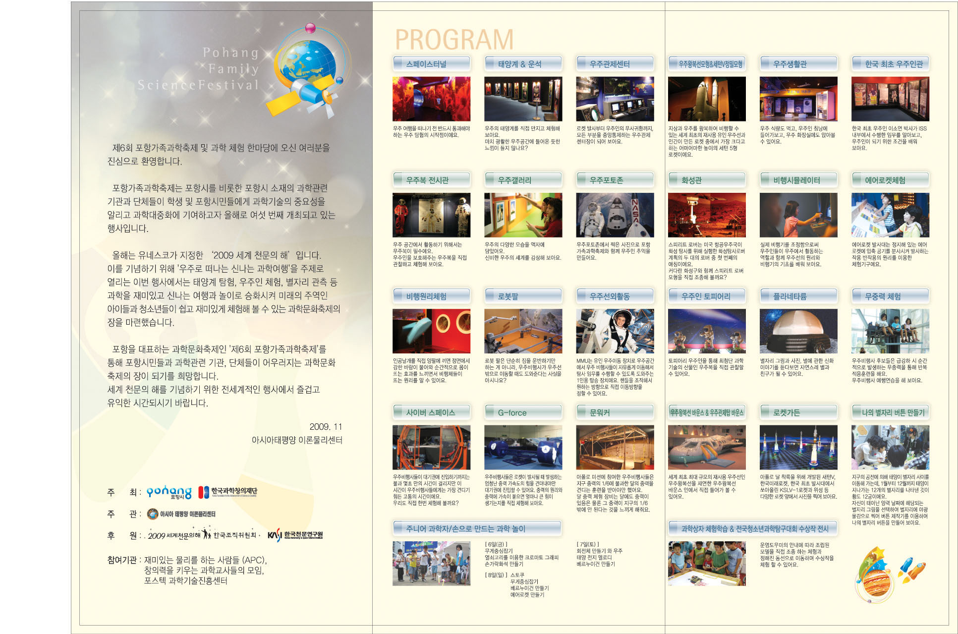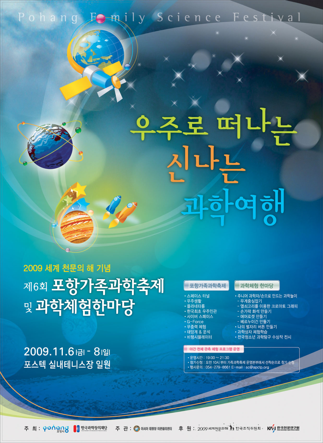 포항가족과학축제는 포항시를 비롯한 포항시 소재의 과학관련 기관과 단체들이 학생 및 포항시민들에게 과학기술의 중요성을 알리고 과학대중화에 기여하고자 올해로 여섯 번째 개최되고 있는 행사입니다. 올해는 유네스코가 지정한 '2009 세계 천문의 해'입니다. 이를 기념하기 위해 '우주로 떠나는 신나는 과학여행'을 주제로 열리는 이번 행사에서는 태양계 탐험, 우주인 체험, 별자리 관측 등 과학을 재미있고 신나는 여행과 놀이로 승화시켜 미래의 주역인 아이들과 청소년들이 쉽고 재미있게 체험해 볼 수 있는 과학문화축제의 장을 마련했습니다.
