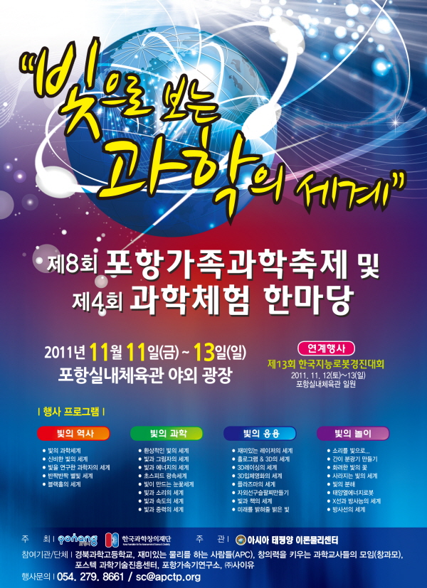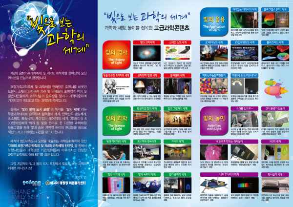 올해는 ‘빛과 불의 도시 포항’의 특색을 ‘빛의 세계’라는 특별과학마로 승화하여 블랙홀의 세계, 반짝반짝 별빛세계, 초스피드 광속세계, 미있는 레이저의 세계, 3D레이싱 & 3D입체영화의 세계 등 빛을 원리로 한 다양한 과학체험 프로그램을 통해 빛에 숨은 과학적 원리와 현상들을 몸으로 직접 느끼고 이해하는 시간을 갖고자 합니다.
