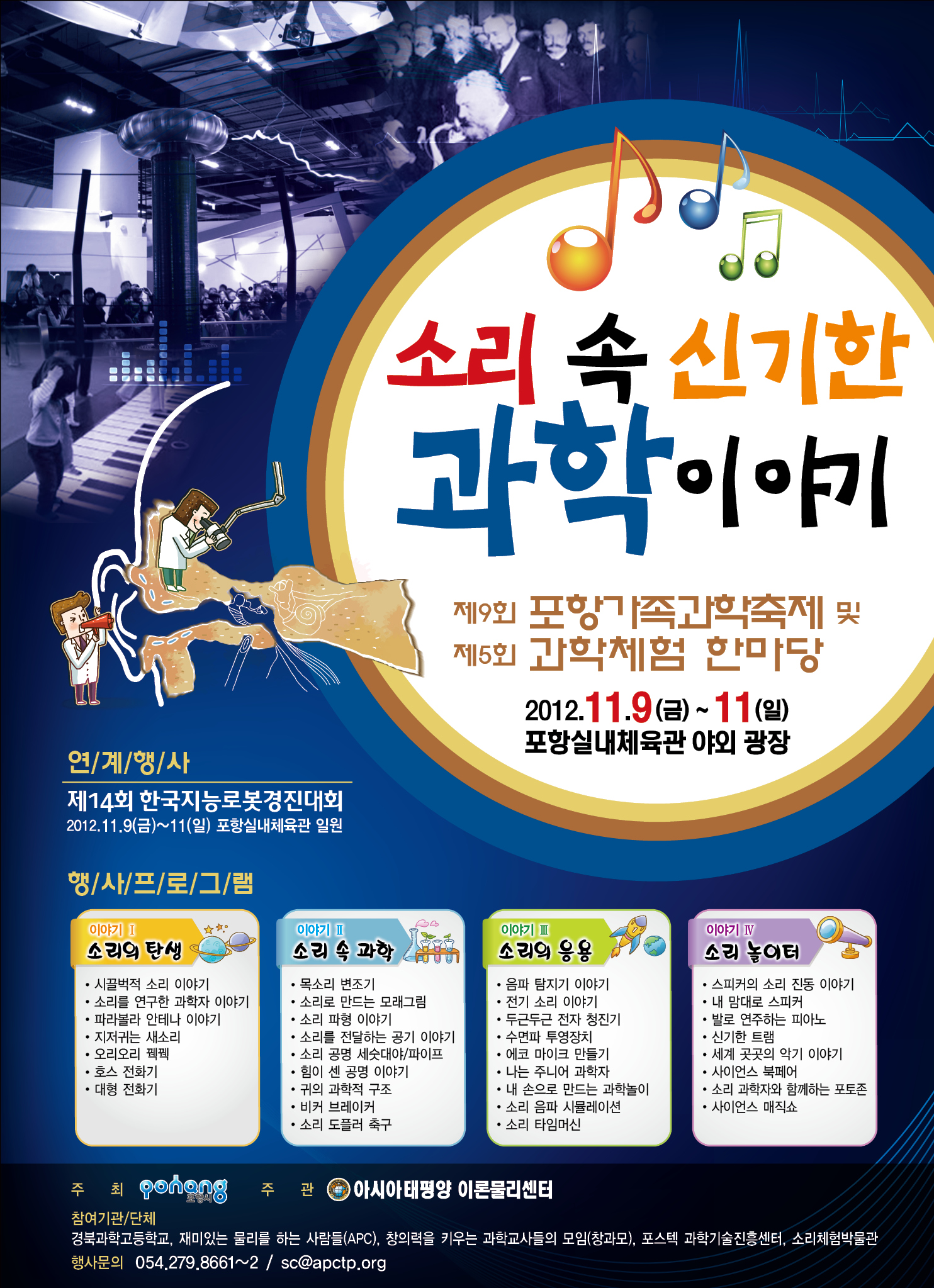 ◦ 행 사 명: 제9회 포항가족과학축제 및 제5회 과학체험 한마당 ◦ 기 간: 2012. 11. 9(금) ∼ 11(일), 3일간 ◦ 장 소: 포항실내체육관 야외광장 ◦ 주 제: 소리 속 신기한 과학 이야기 ◦ 대 상: 학생 및 일반인 등 ◦ 주 최: 포항시 ◦ 주 관: 아시아태평양 이론물리센터