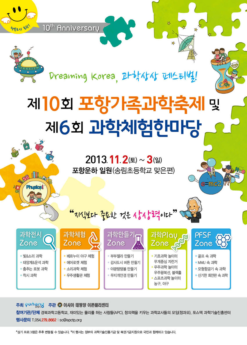 ◦ 행 사 명: 제10회 포항가족과학축제 및 제6회 과학체험 한마당 ◦ 기 간: 2013. 11. 2(토) ∼ 3(일), 2일간 ◦ 장 소: 포항운하 일원(송림초등학교 맞은편) ◦ 주 제: Dreaming Korea, 과학 상상 페스티벌! ◦ 대 상: 학생 및 일반인 등 ◦ 주 최: 포항시 ◦ 주 관: 아시아태평양 이론물리센터 ◦ 참여기관: 경북과학고등학교, 재미있는 물리를 하는 사람들(APC), 창의력을 키우는 과학교사들의 모임(창과모), 포스텍 과학기술진흥센터 ◦ 행사문의: 054-279-8662 / sc@apctp.org . Attach Files