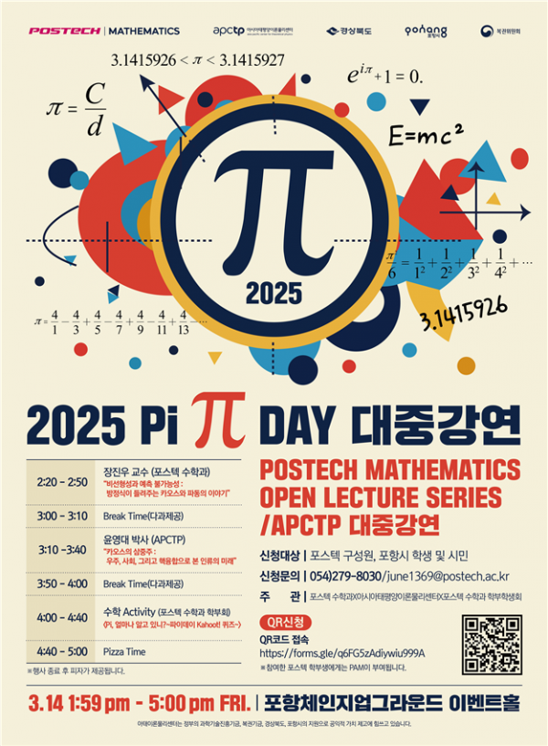 아시아태평양이론물리센터(이하 APCTP)와 포스텍 수학과가 3월 14일 파이데이(Pi Day)를 맞아 학생과 시민 대상으로 특별한 공개강좌를 개최한다. 파이데이는 수학에서 중요한 상수인 원주율(π, 3.14159…)을 기념하는 날로, 매년 전 세계적으로 다양한 행사가 열리는 수학과 과학의 축제다. 올해 행사는 3월 14일 오후 1시 59분(π의 소수점 이하 네 자리를 반영한 시간)에 개회식을 시작으로 본 강연이 진행될 예정이다.