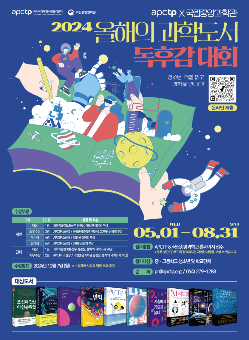 책과 과학에 대한 관심 증진, 과학기술문화 저변 확산을 위하여 독서를 취미로 하는 청소년 대상으로 APCTP 올해의 과학도서 10권에 관한 독후감 대회를 개최합니다.