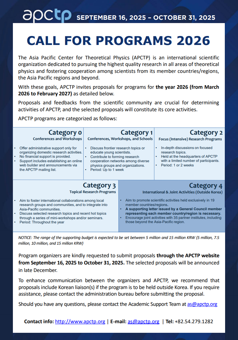 With these goals, APCTP invites proposals for programs of the year 2026(from March 2026 to February 2027) as detailed below.