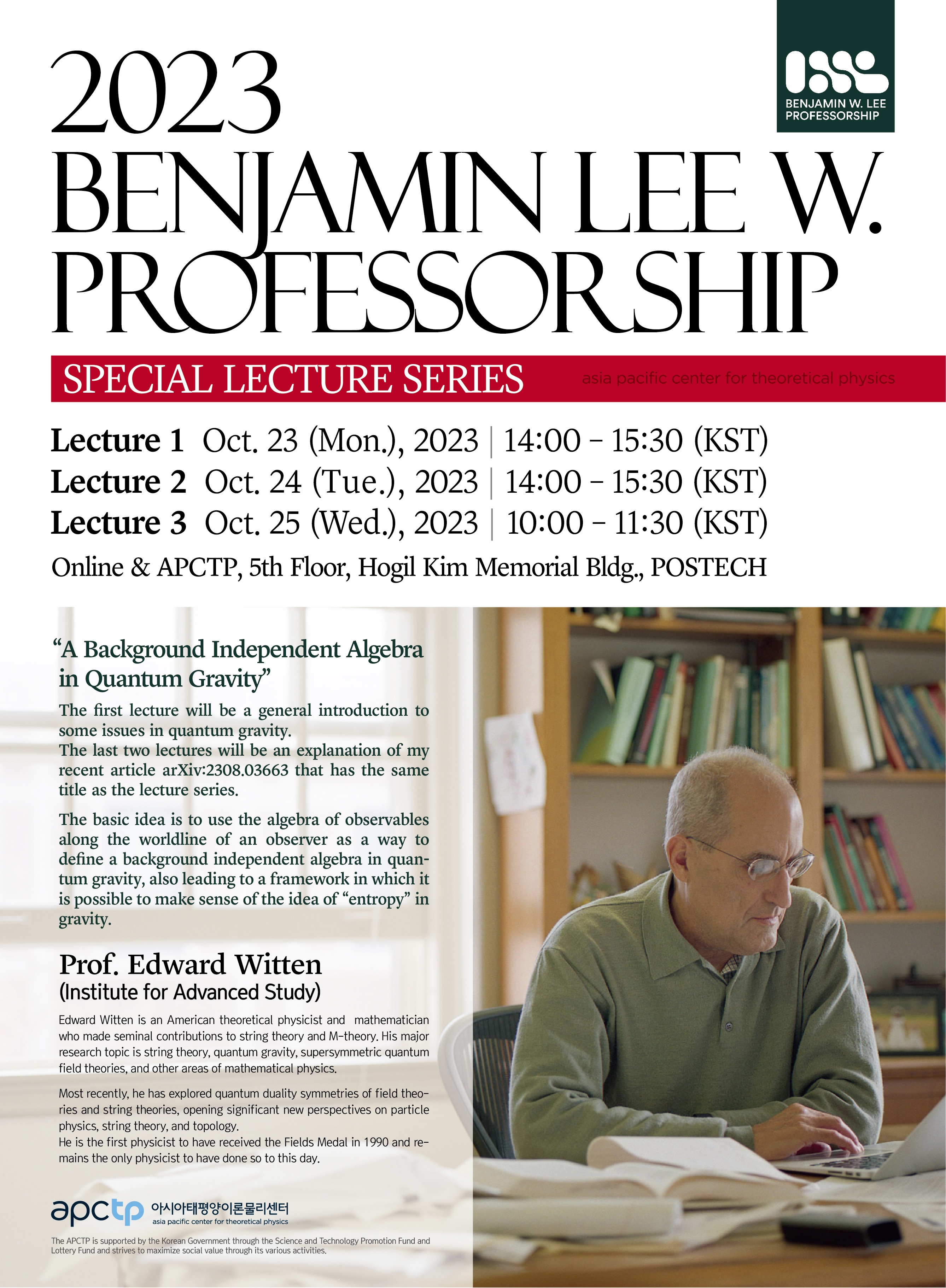 Benjamin Lee Professorship Lecture Series [Poster Download] Date : Oct. 23(Mon.) – 26(Thu.), 2023 Program :