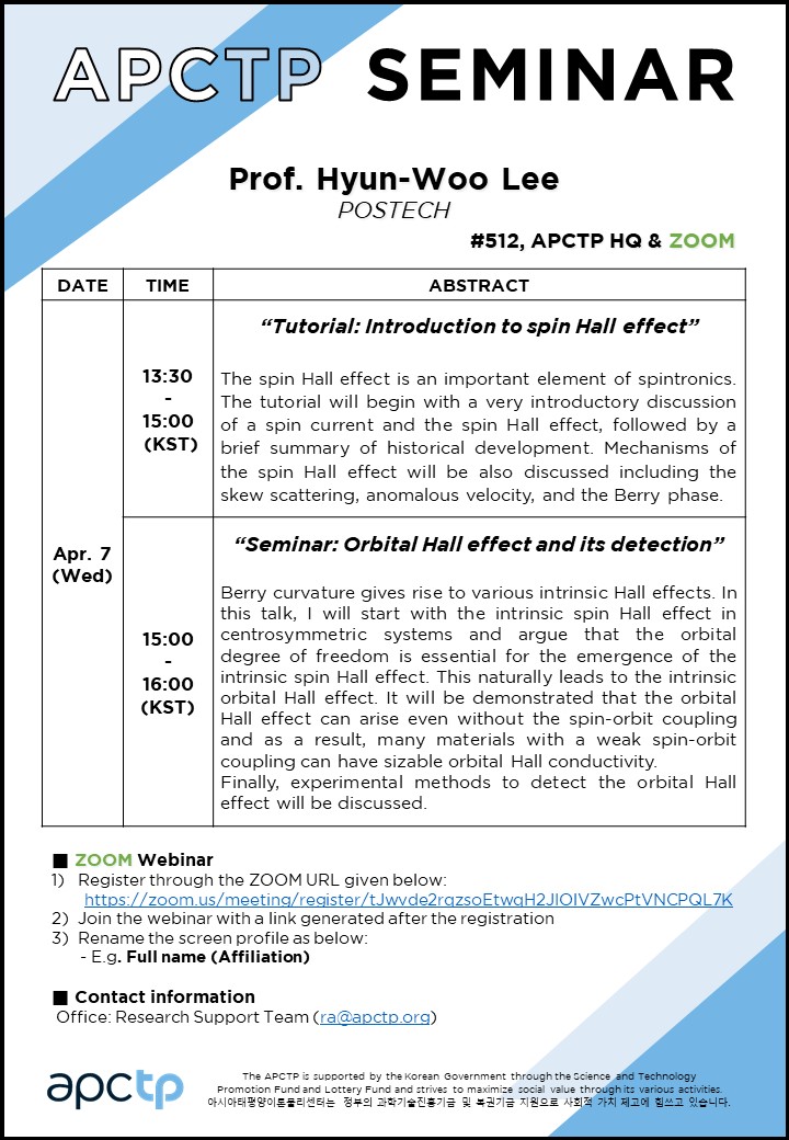 | Place | #512, APCTP HQ, Online via ZOOM | ||||||