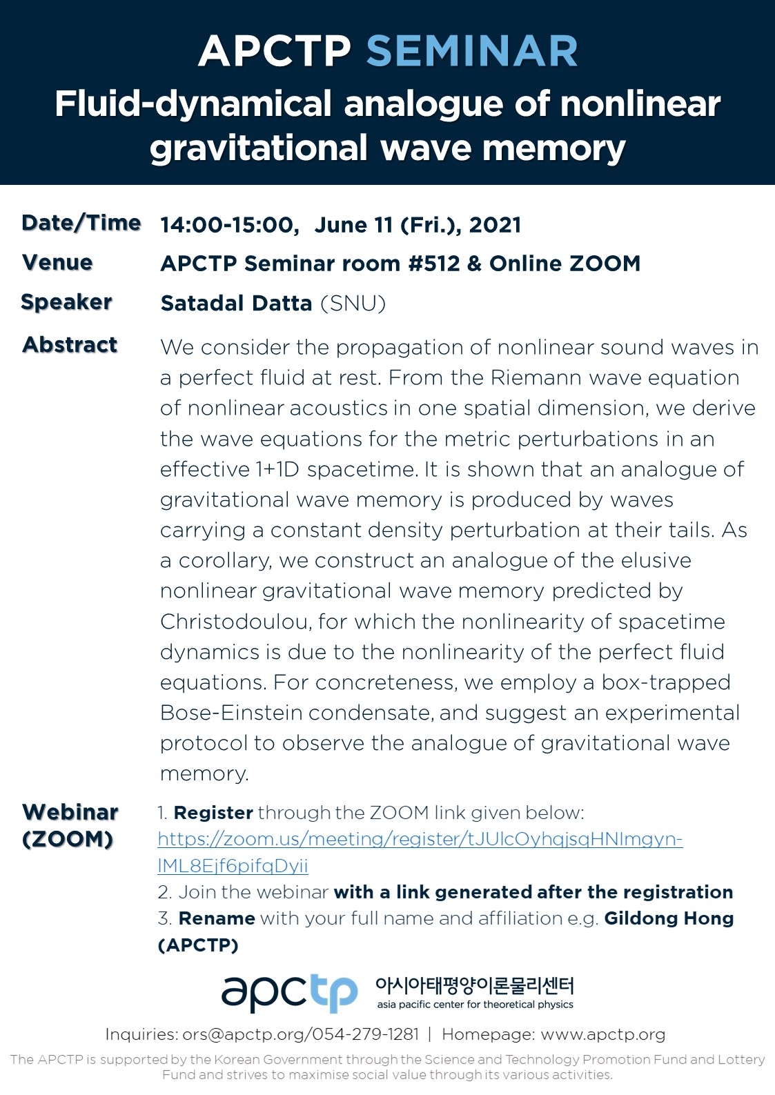 | Place | #512, APCTP HQ & Online via ZOOM | ||||||