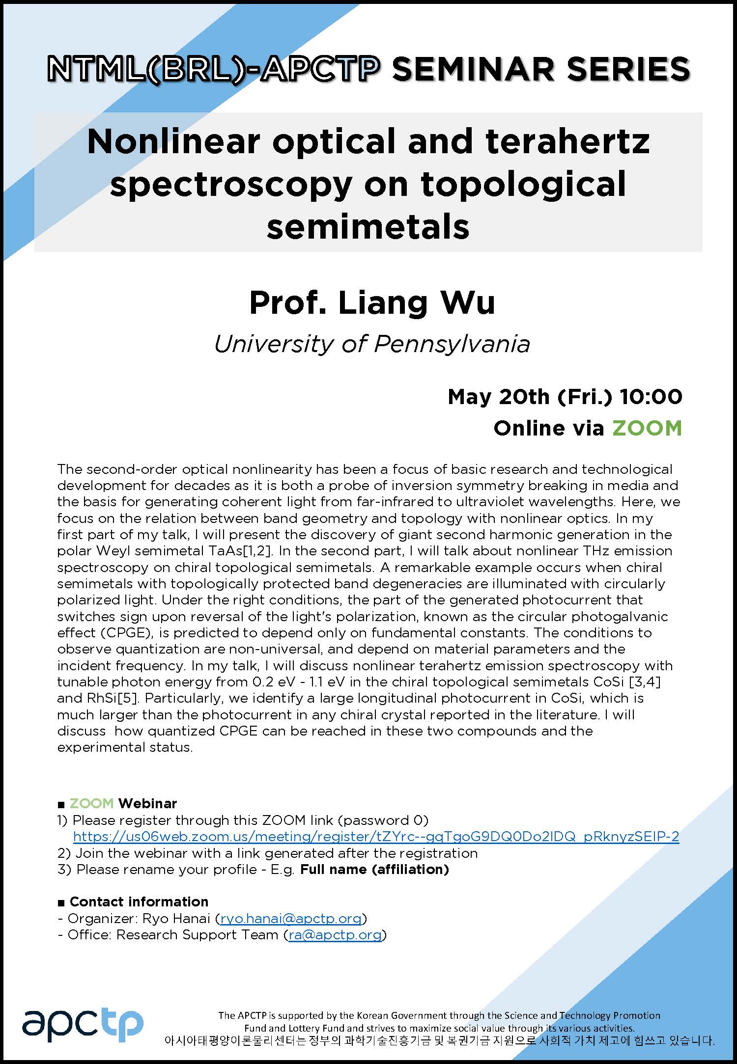 | Title | [JRG] NTML(BRL)-APCTP Seminar Series on Topological Matter Out of Equilibrium: Nonlinear optical and terahertz spectroscopy on topological semimetals | ||||||