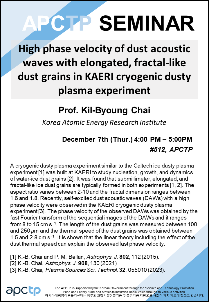 | Title | High phase velocity of dust acoustic waves with elongated, fractal-like dust grains in KAERI cryogenic dusty plasma experiment | ||||||